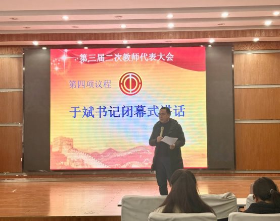 最后,于斌书记对本次教代会做总结。他代表学校领导班子对大会的成功召开表示热烈祝贺,向各位代表的辛勤付出表示衷心感谢,并号召老师们更加紧密团结起来,以更加昂扬的斗志,更加务实的作风,踔厉奋发,共同为学校的高质量发展贡献智慧和力量。