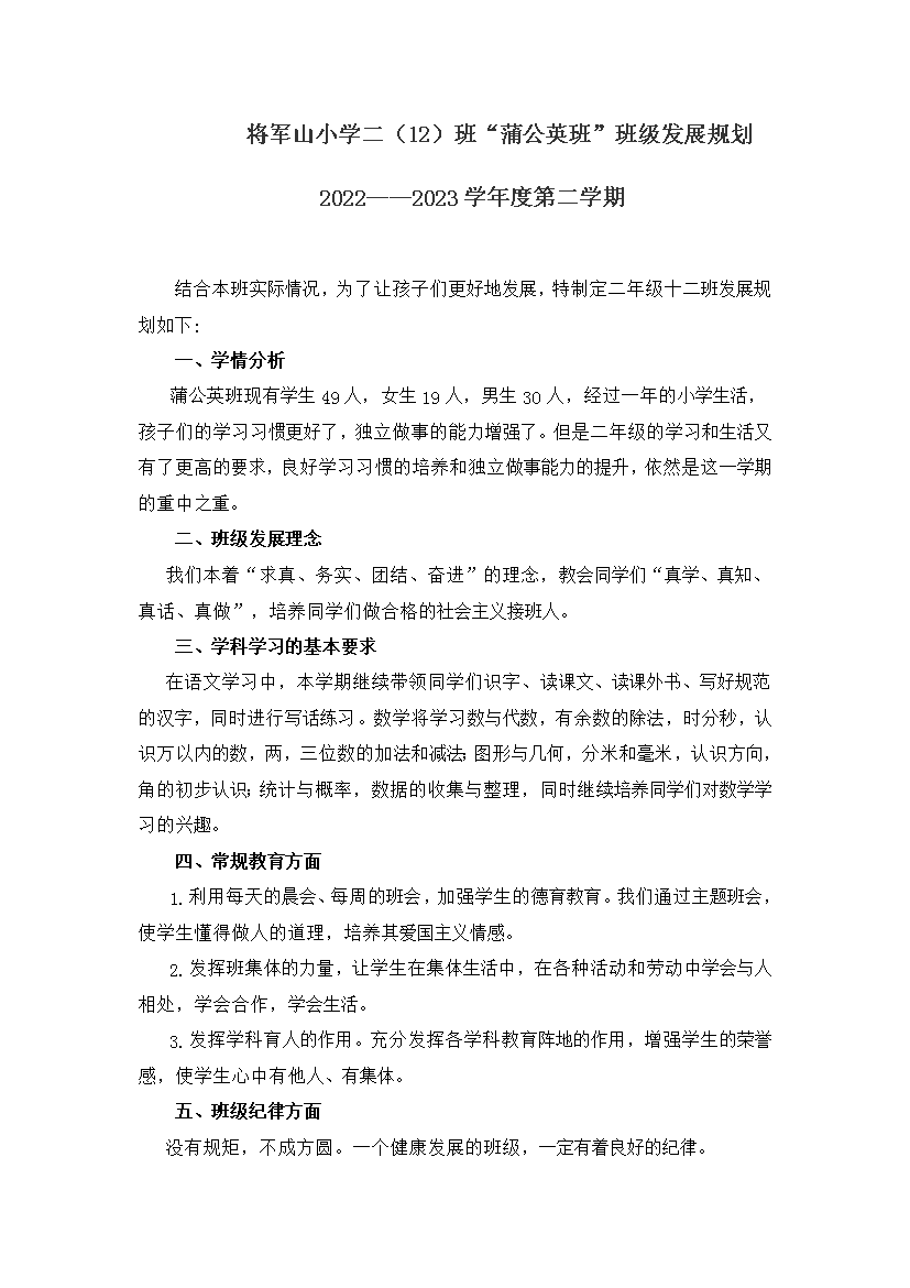 :二(9)班 2022-2023学年第二学期班级发展规划