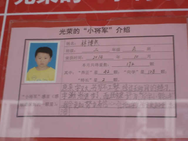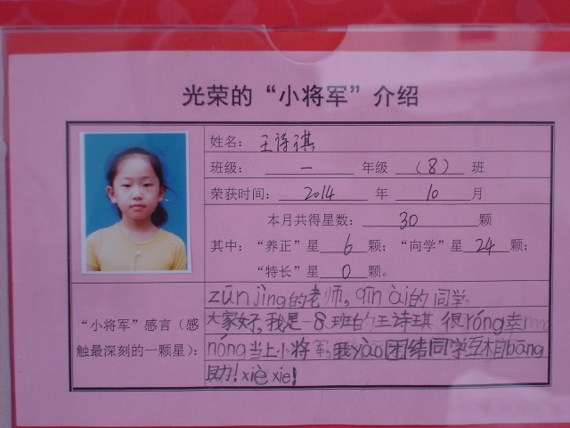 从九月底开始,我校进行了“个个争五星,人人当将军”的评比,一大批优秀的学生脱颖而出,大大激发了同学们争先创优的积极性,现在,就让我们来回顾一下第一批“小将军”的风采和感言吧!