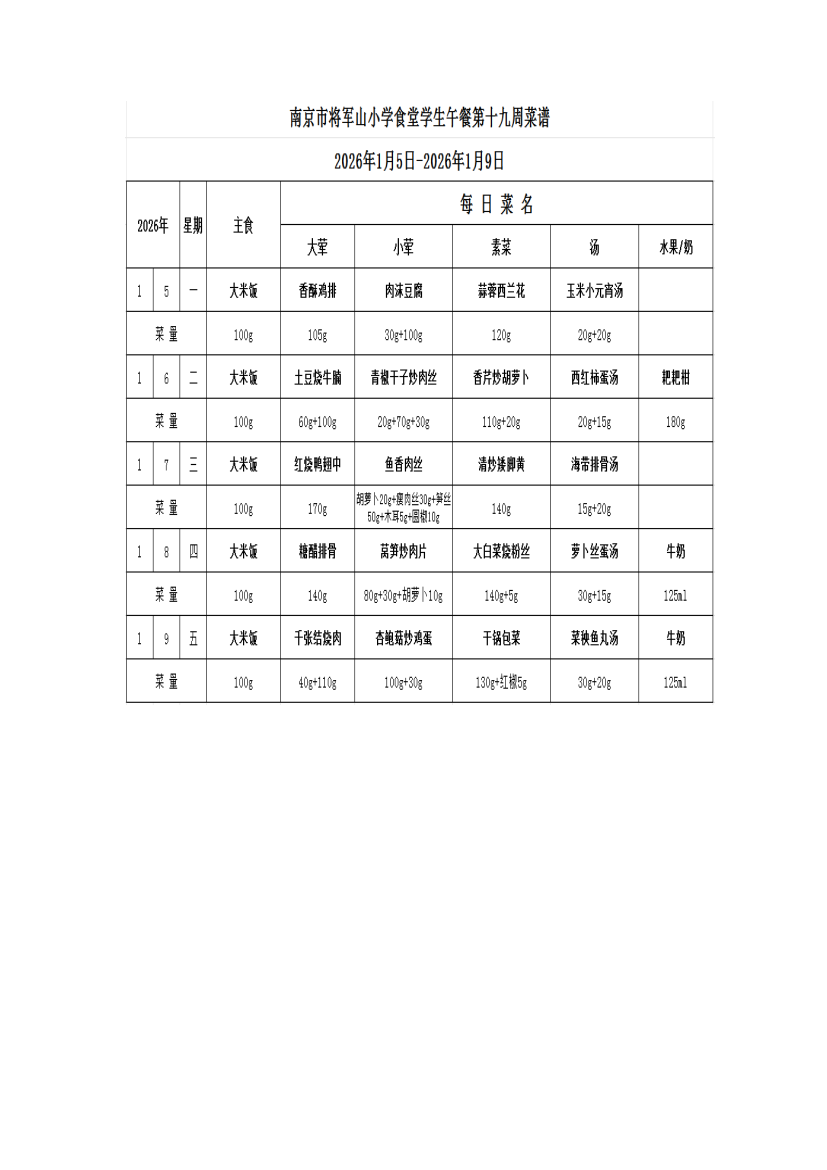 南京市将军山小学食堂学生第十九周菜谱