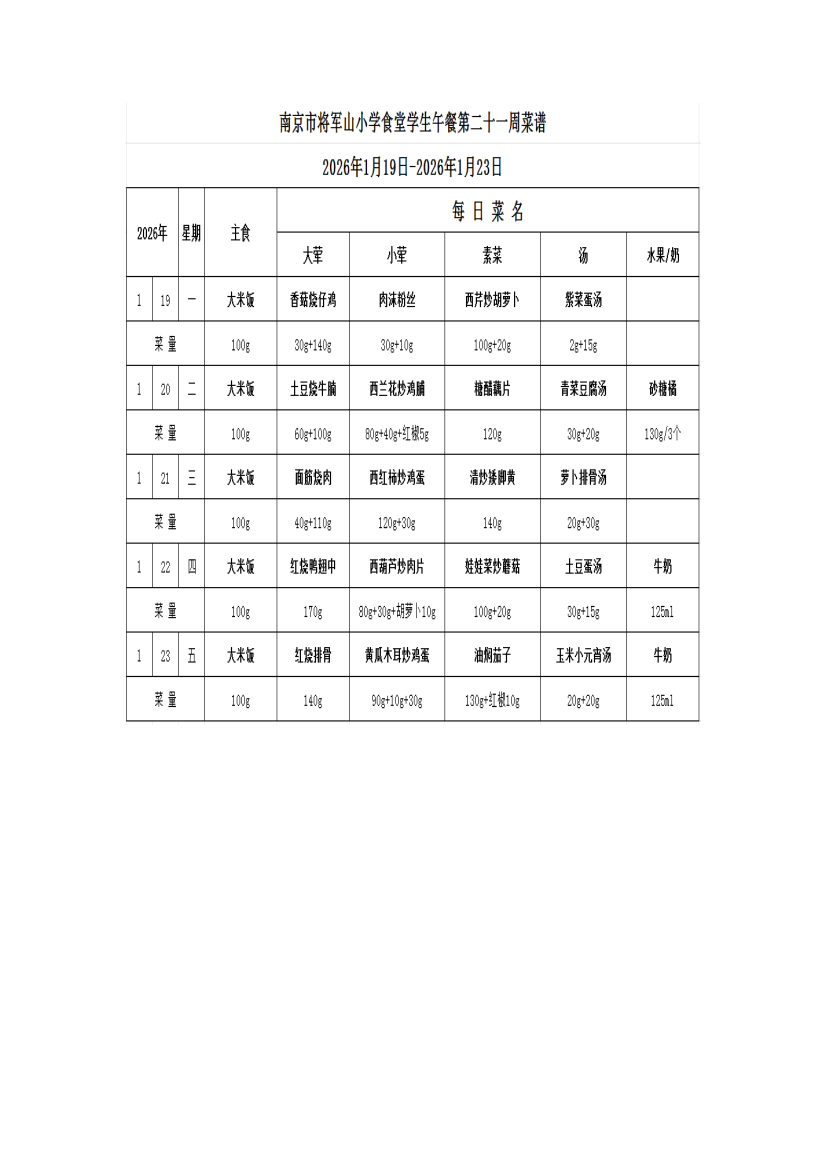 南京市将军山小学食堂学生第二十一周菜谱