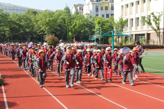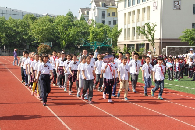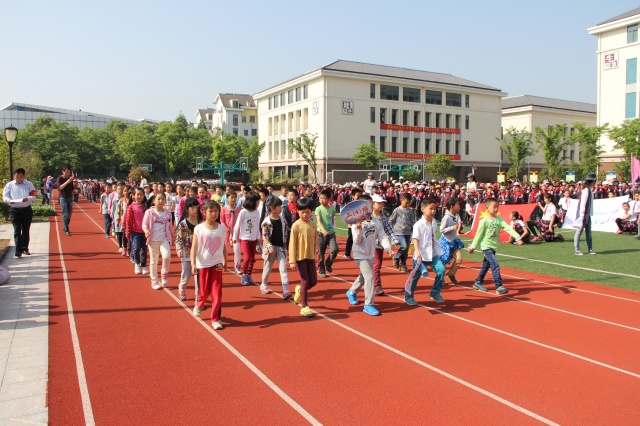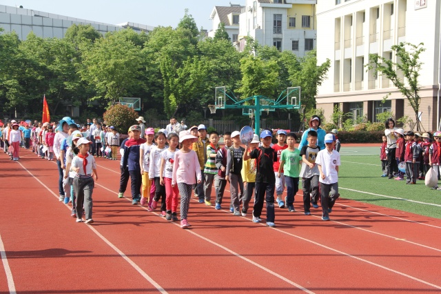 4月30日早晨,学校操场上彩旗招展,乐曲悠扬,我校第四届学生运动会开幕式各项准备工作有序进行,各路方阵在各自指定地点集结待命。当进行曲响起,国旗、校旗、第四届学生运动会会旗、彩旗、裁判员和各个班列队方阵迈着整齐有力的步伐有序地从主席台前走过。先是由张屹副校长解说了前面几个方队:“鲜艳的五星红旗曾经指引着中国革命的方向,今后也永远是咱们实现中国梦的指路明灯。为国旗添彩,是我们永恒的使命;为国歌壮威是我们无尚的光荣。……”“ 正向我们走来的是校旗、校徽方队。洁白的校旗上镶嵌着一枚盾牌造型我校标志,总体设计理念来源于学校地处将军山的地缘特征;来源于学校“追寻本真”的办学理念。以对称的两个“J”(“将军”的首字母)变幻为古代将军战甲上的纹饰,柔和金文“山”字,体现“将军山小学”之意。为校旗增光、为校徽添彩,是我们每个人的共同心声。”“我校的学生运动会已经举办过三届,正向我们走来的是第四届学生运动会会旗,第三届是描绘的学生在跳远的图形,本届是用红色的四条跑道书写了阿拉伯数“4”字,一位穿着校服的学生从左下角起跑,一直冲向了右边的终点,体现“自强进取,将小必胜!”的信念。”……