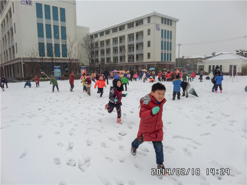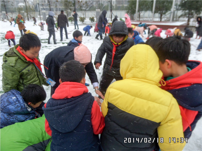 今天下午放学前,学校组织各班进行了堆雪人比赛。看,