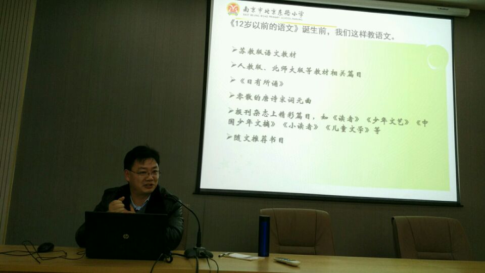 2017年1月5日,北京东路小学的朱志林主任应邀带着《12岁以前的语文》到我校讲座。他先介绍了《12岁以前的语文》这套书,该书按年级分为六册。其中收录了《弟子规》《三字经》《笠翁对韵》《千字文》《大学》《中庸》《论语》《孟子》《老子》《庄子》等国学经典;收录了唐诗、宋词、《诗经》《古诗19首》《楚辞》、冰心、泰戈尔、普希金等经典的古体诗词和现代诗歌;还收录了绘本、童话、儿童小说等经典的儿童文学作品。